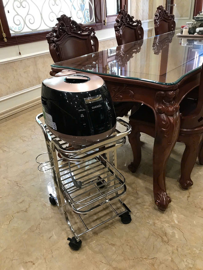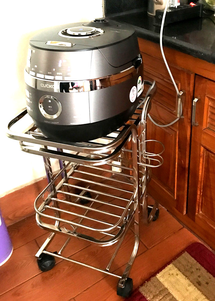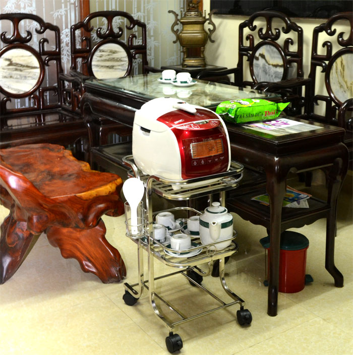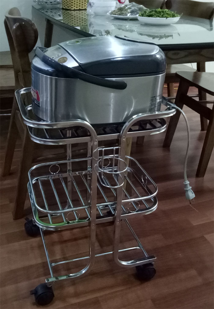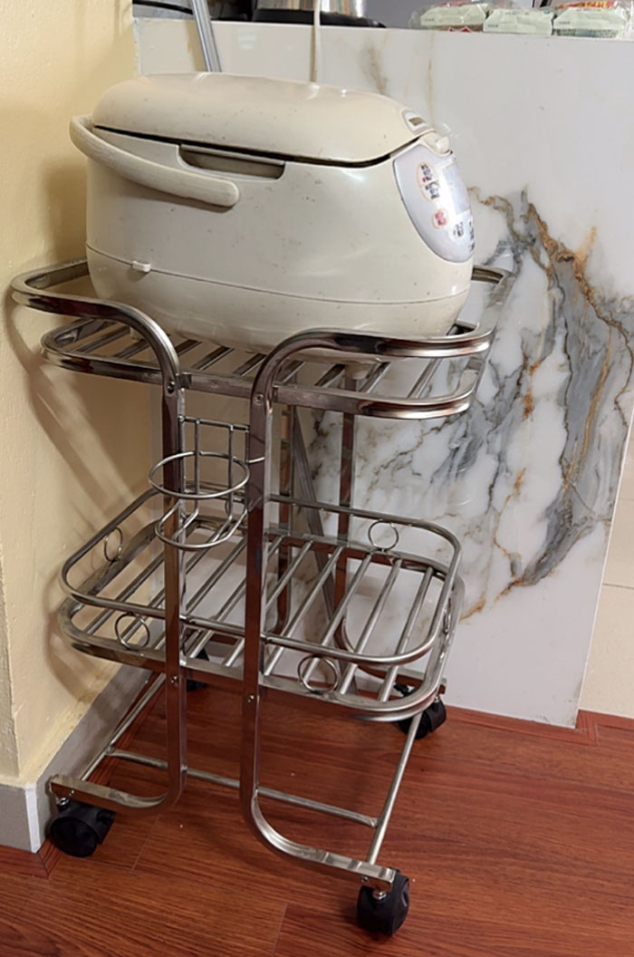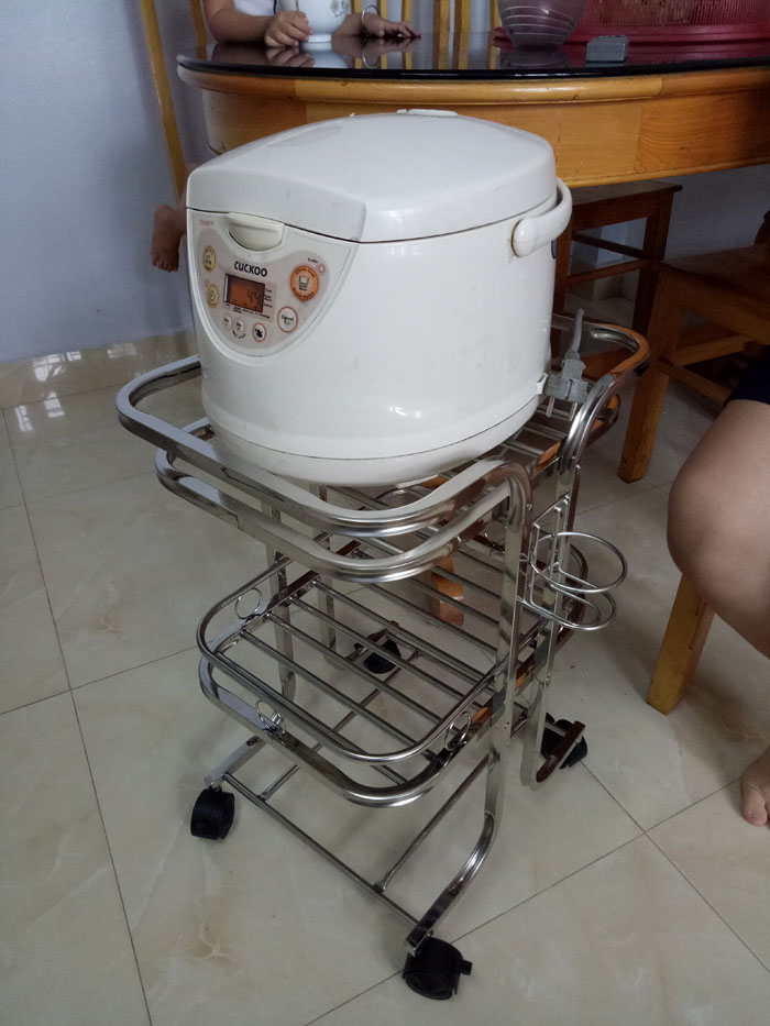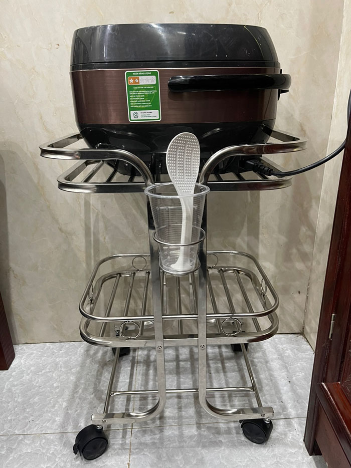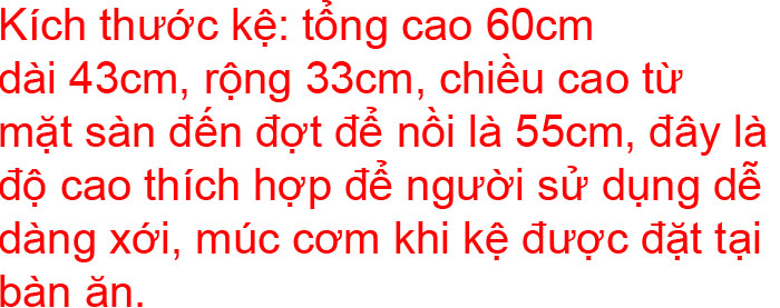 Kệ được làm băng inox chất lượng cao có bánh xe cổ xoay 360 độ rất dễ dàng di chuyển hay tùy chỉnh đặt cố định bằng bộ hãm gạt trên bánh xe. Kệ có nhiều thành phần được dễ dàng lắp ghép với nhau bằng các bộ bulong và ốc vít inox bao gồm chân kệ, đợt đặt nồi, đợt để đồ, đợt chân, giọ để cốc cài muôi xới cơm, bánh xe. Kích thước của kệ cao 60cm x dài 43cm x rộng 33cm, cao 55cm từ sàn tới mặt đợt để nồi, đây là khoảng cách rất thích hợp giúp cho người sử dụng dễ dàng xới, múc cơm khi được đặt gần bàn ăn trong bữa cơm gia đình. Nồi cơm điện có thể được đặt cố định trên kệ thay vì đặt trên mặt bàn bếp nơi đã quá tải bởi các thiết bị nhà bếp khác như lò vi sóng, máy xay sinh tố, máy trộn bột v.v, Để di chuyển tới nơi vo gạo, nơi có ổ cắm điện khi nấu cơm và di chuyển tới bàn ăn để phục vụ bữa cơm gia đình. Sau đó người sử dụng có thể di chuyển kệ đến một vị trí thích hợp để tiết kiệam không gian phòng ăn, phòng bếp. Với tính năng này kệ rất thích hợp với những nơi có diện tích nhỏ như căn hộ chung cư, nhà phố v.v. Kiểu dáng sang trọng, vững chắc và đặt được mọi chủng loại nồi cơm điện trên thị trường dù là hình chữ nhật hay hình tròn. Với đợt để đồ, có thể để các vật dụng như bát, đĩa, thìa, đũa, giấy ăn, đồ ăn nóng v.v. Kệ là một dụng cụ gia dụng chuyên dụng để nồi cơm điện cho bàn ăn phục vụ bữa cơm gia đình. Kệ có thể tháo lắp thành nhiều thành phần để đóng gói cho việc vận chuyển và lưu kho.