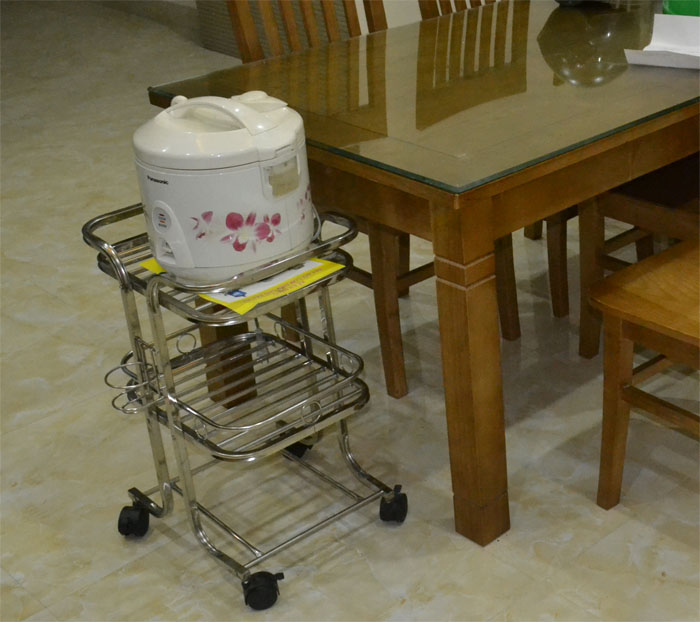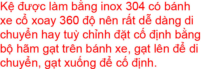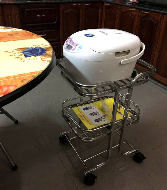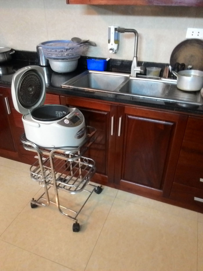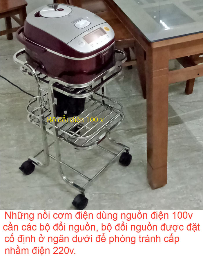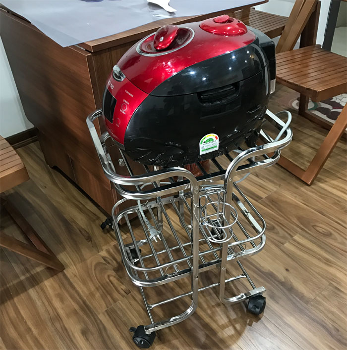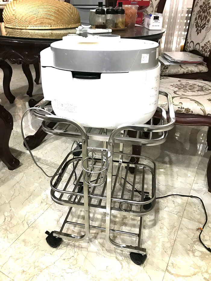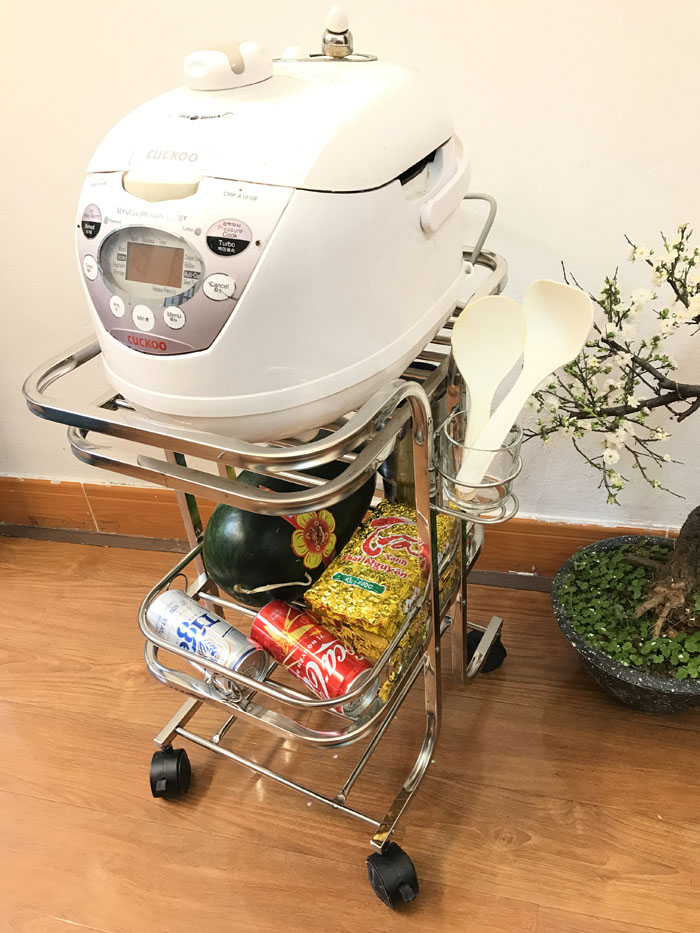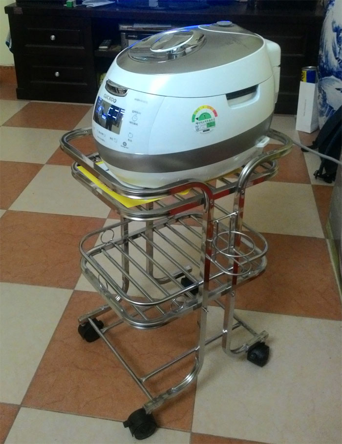 Kệ được làm băng inox chất lượng cao có bánh xe cổ xoay 360 độ rất dễ dàng di chuyển hay tùy chỉnh đặt cố định bằng bộ hãm gạt trên bánh xe. Kệ có nhiều thành phần được dễ dàng lắp ghép với nhau bằng các bộ bulong và ốc vít inox bao gồm chân kệ, đợt đặt nồi, đợt để đồ, đợt chân, giọ để cốc cài muôi xới cơm, bánh xe. Kích thước của kệ cao 60cm x dài 43cm x rộng 33cm, cao 55cm từ sàn tới mặt đợt để nồi, đây là khoảng cách rất thích hợp giúp cho người sử dụng dễ dàng xới, múc cơm khi được đặt gần bàn ăn trong bữa cơm gia đình. Nồi cơm điện có thể được đặt cố định trên kệ thay vì đặt trên mặt bàn bếp nơi đã quá tải bởi các thiết bị nhà bếp khác như lò vi sóng, máy xay sinh tố, máy trộn bột v.v, Để di chuyển tới nơi vo gạo, nơi có ổ cắm điện khi nấu cơm và di chuyển tới bàn ăn để phục vụ bữa cơm gia đình. Sau đó người sử dụng có thể di chuyển kệ đến một vị trí thích hợp để tiết kiệam không gian phòng ăn, phòng bếp. Với tính năng này kệ rất thích hợp với những nơi có diện tích nhỏ như căn hộ chung cư, nhà phố v.v. Kiểu dáng sang trọng, vững chắc và đặt được mọi chủng loại nồi cơm điện trên thị trường dù là hình chữ nhật hay hình tròn. Với đợt để đồ, có thể để các vật dụng như bát, đĩa, thìa, đũa, giấy ăn, đồ ăn nóng v.v. Kệ là một dụng cụ gia dụng chuyên dụng để nồi cơm điện cho bàn ăn phục vụ bữa cơm gia đình. Kệ có thể tháo lắp thành nhiều thành phần để đóng gói cho việc vận chuyển và lưu kho.