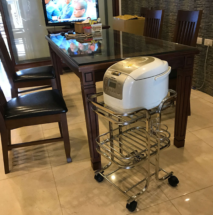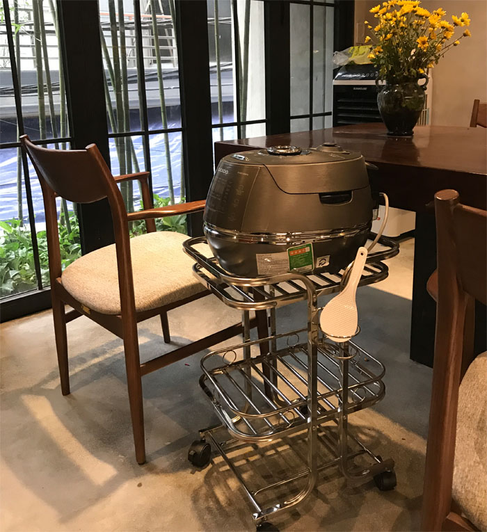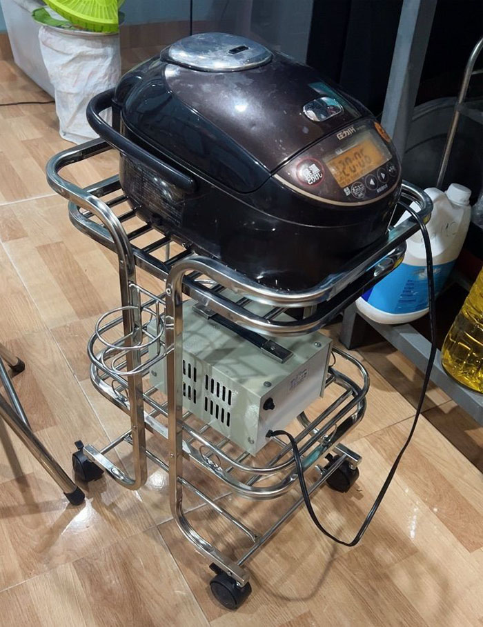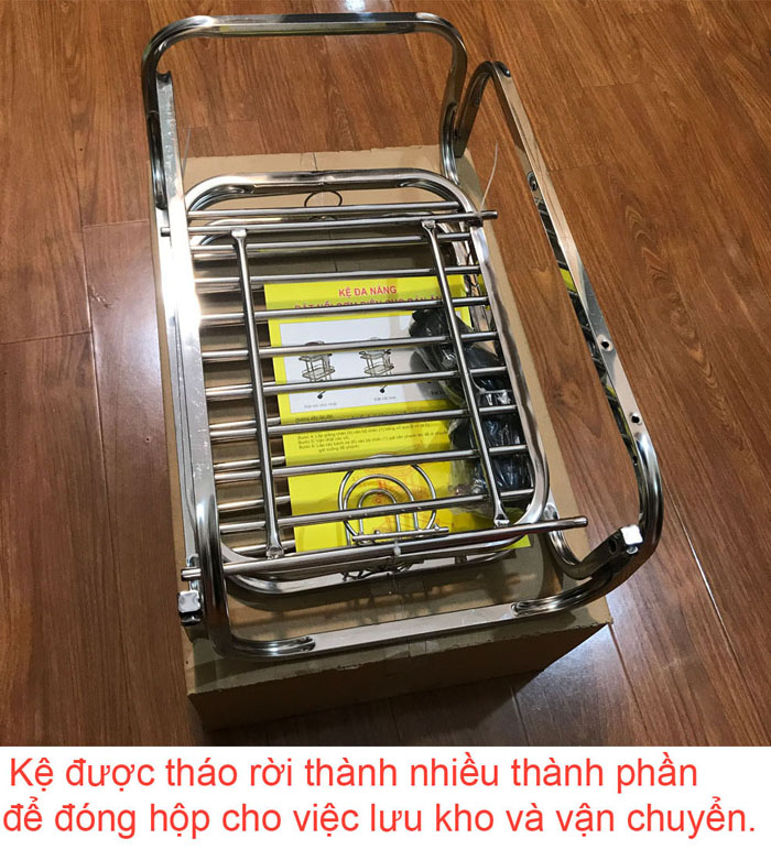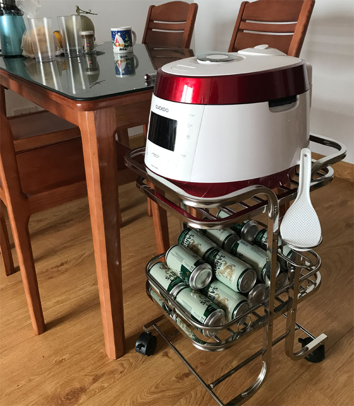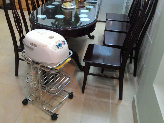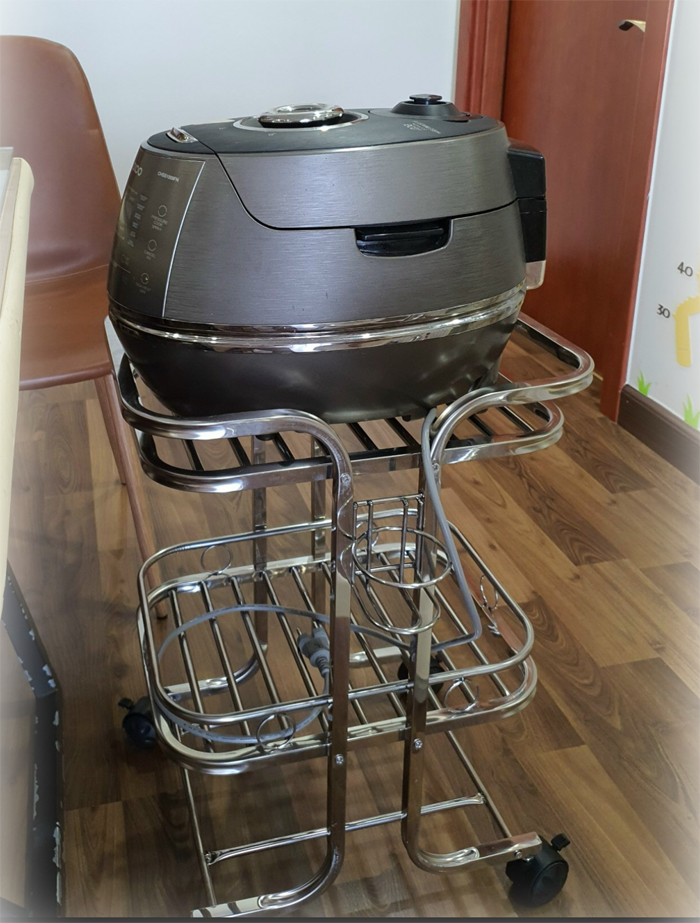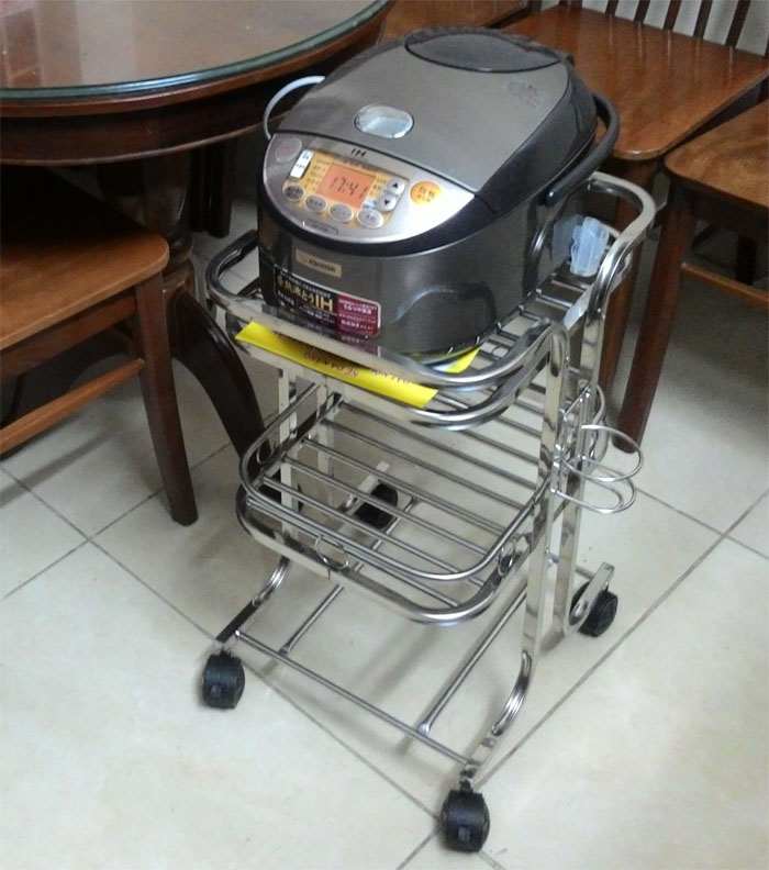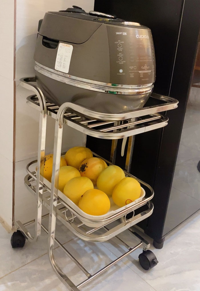 Kệ được làm băng inox chất lượng cao có bánh xe cổ xoay 360 độ rất dễ dàng di chuyển hay tùy chỉnh đặt cố định bằng bộ hãm gạt trên bánh xe. Kệ có nhiều thành phần được dễ dàng lắp ghép với nhau bằng các bộ bulong và ốc vít inox bao gồm chân kệ, đợt đặt nồi, đợt để đồ, đợt chân, giọ để cốc cài muôi xới cơm, bánh xe. Kích thước của kệ cao 60cm x dài 43cm x rộng 33cm, cao 55cm từ sàn tới mặt đợt để nồi, đây là khoảng cách rất thích hợp giúp cho người sử dụng dễ dàng xới, múc cơm khi được đặt gần bàn ăn trong bữa cơm gia đình. Nồi cơm điện có thể được đặt cố định trên kệ thay vì đặt trên mặt bàn bếp nơi đã quá tải bởi các thiết bị nhà bếp khác như lò vi sóng, máy xay sinh tố, máy trộn bột v.v, Để di chuyển tới nơi vo gạo, nơi có ổ cắm điện khi nấu cơm và di chuyển tới bàn ăn để phục vụ bữa cơm gia đình. Sau đó người sử dụng có thể di chuyển kệ đến một vị trí thích hợp để tiết kiệam không gian phòng ăn, phòng bếp. Với tính năng này kệ rất thích hợp với những nơi có diện tích nhỏ như căn hộ chung cư, nhà phố v.v. Kiểu dáng sang trọng, vững chắc và đặt được mọi chủng loại nồi cơm điện trên thị trường dù là hình chữ nhật hay hình tròn. Với đợt để đồ, có thể để các vật dụng như bát, đĩa, thìa, đũa, giấy ăn, đồ ăn nóng v.v. Kệ là một dụng cụ gia dụng chuyên dụng để nồi cơm điện cho bàn ăn phục vụ bữa cơm gia đình. Kệ có thể tháo lắp thành nhiều thành phần để đóng gói cho việc vận chuyển và lưu kho.