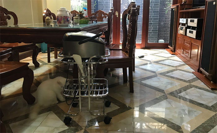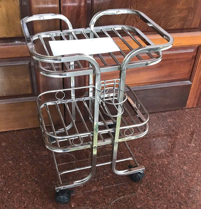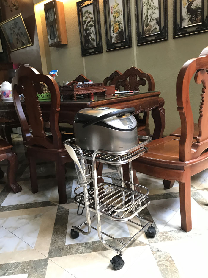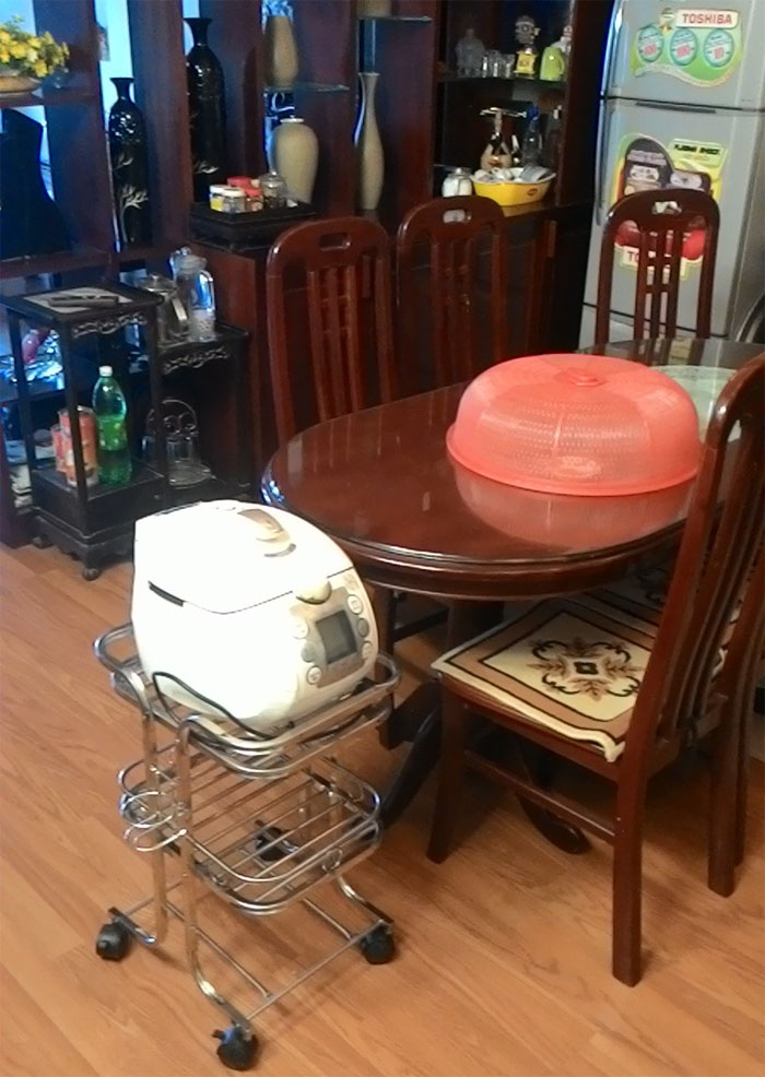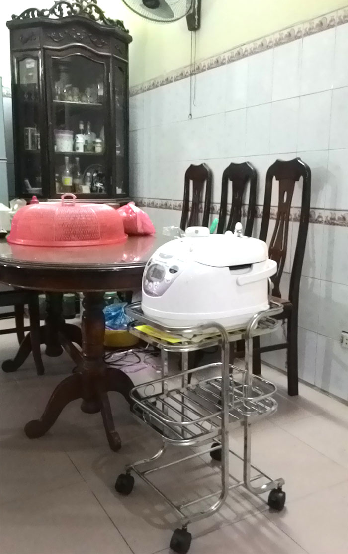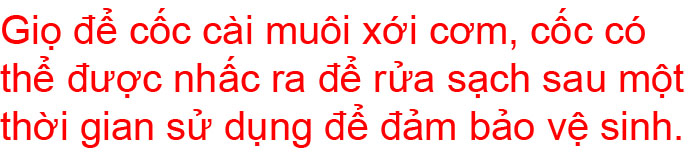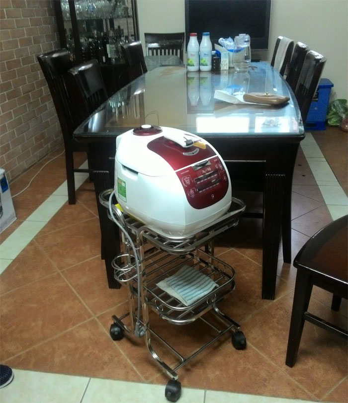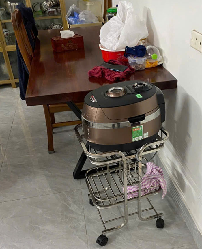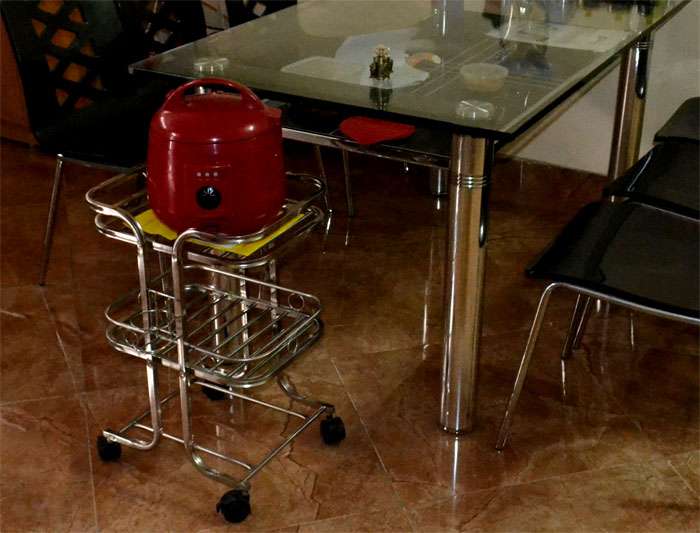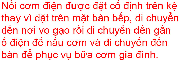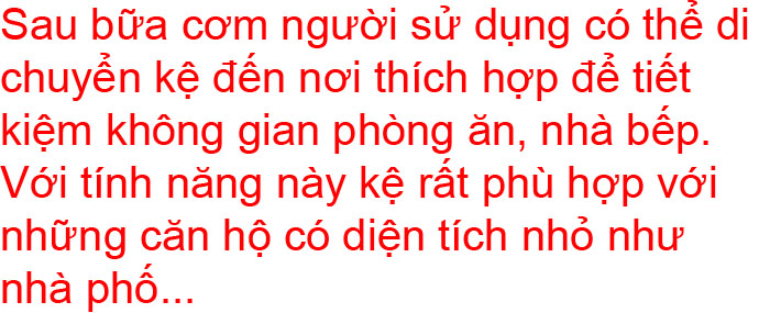 Kệ được làm băng inox chất lượng cao có bánh xe cổ xoay 360 độ rất dễ dàng di chuyển hay tùy chỉnh đặt cố định bằng bộ hãm gạt trên bánh xe. Kệ có nhiều thành phần được dễ dàng lắp ghép với nhau bằng các bộ bulong và ốc vít inox bao gồm chân kệ, đợt đặt nồi, đợt để đồ, đợt chân, giọ để cốc cài muôi xới cơm, bánh xe. Kích thước của kệ cao 60cm x dài 43cm x rộng 33cm, cao 55cm từ sàn tới mặt đợt để nồi, đây là khoảng cách rất thích hợp giúp cho người sử dụng dễ dàng xới, múc cơm khi được đặt gần bàn ăn trong bữa cơm gia đình. Nồi cơm điện có thể được đặt cố định trên kệ thay vì đặt trên mặt bàn bếp nơi đã quá tải bởi các thiết bị nhà bếp khác như lò vi sóng, máy xay sinh tố, máy trộn bột v.v, Để di chuyển tới nơi vo gạo, nơi có ổ cắm điện khi nấu cơm và di chuyển tới bàn ăn để phục vụ bữa cơm gia đình. Sau đó người sử dụng có thể di chuyển kệ đến một vị trí thích hợp để tiết kiệam không gian phòng ăn, phòng bếp. Với tính năng này kệ rất thích hợp với những nơi có diện tích nhỏ như căn hộ chung cư, nhà phố v.v. Kiểu dáng sang trọng, vững chắc và đặt được mọi chủng loại nồi cơm điện trên thị trường dù là hình chữ nhật hay hình tròn. Với đợt để đồ, có thể để các vật dụng như bát, đĩa, thìa, đũa, giấy ăn, đồ ăn nóng v.v. Kệ là một dụng cụ gia dụng chuyên dụng để nồi cơm điện cho bàn ăn phục vụ bữa cơm gia đình. Kệ có thể tháo lắp thành nhiều thành phần để đóng gói cho việc vận chuyển và lưu kho.